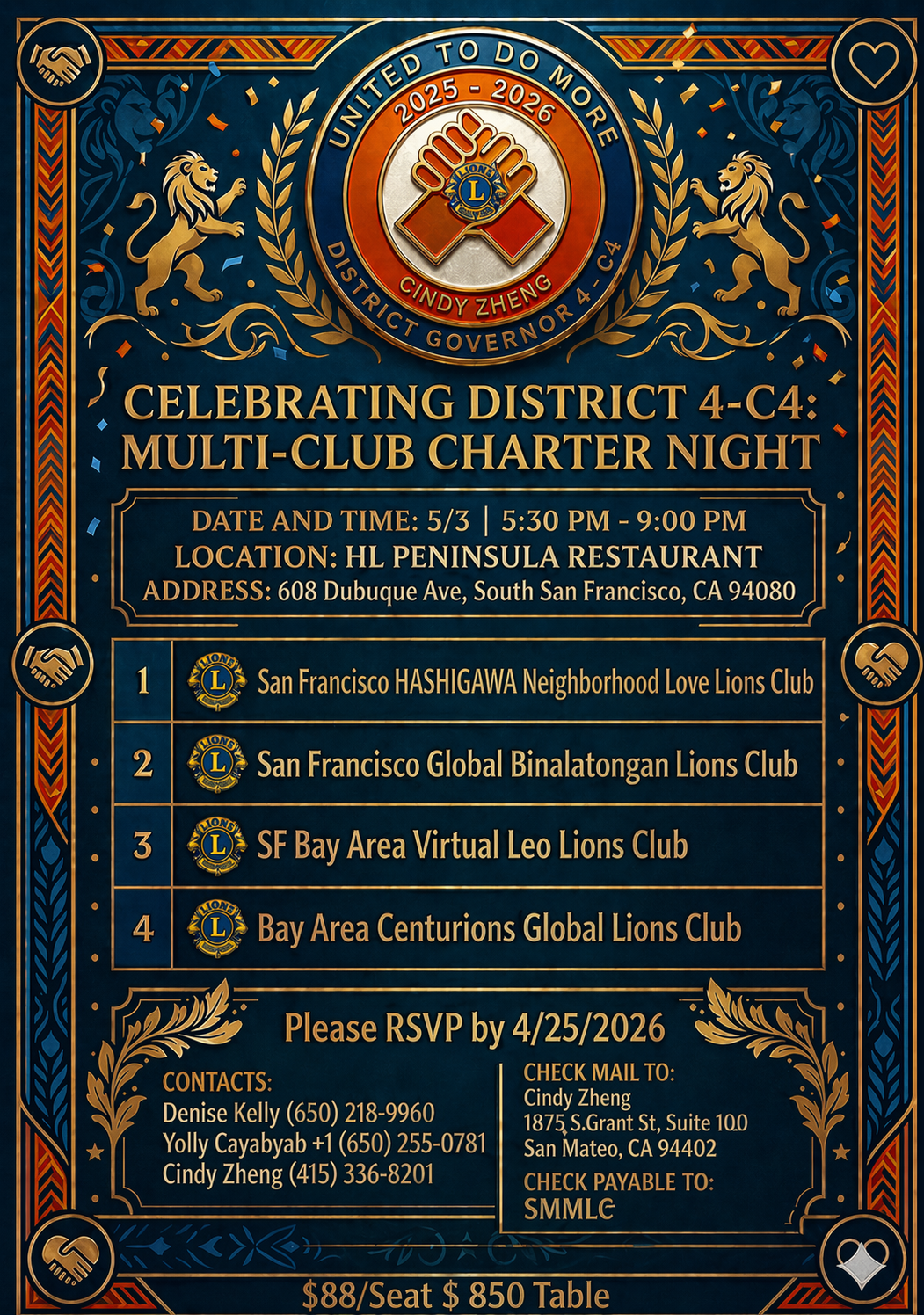 Posted inDistrict Communications Celebrate & Support District 4-C4 New Lions – Join Us! Posted by By District 4-C4 Communications Committee April 22, 2026 Celebrate & Support District 4-C4 New Lions – Join Us! RSVP to lions4service@gmail.com Lions District 4-C4 | (415) 545-8107 P.O. Box 25301 | San Mateo, CA 94402 US Unsubscribe | Update Profile | Constant Contact Data Notice District 4-C4 Communications Committee View All Posts Post navigation Previous Post The Thread: 04/19/26